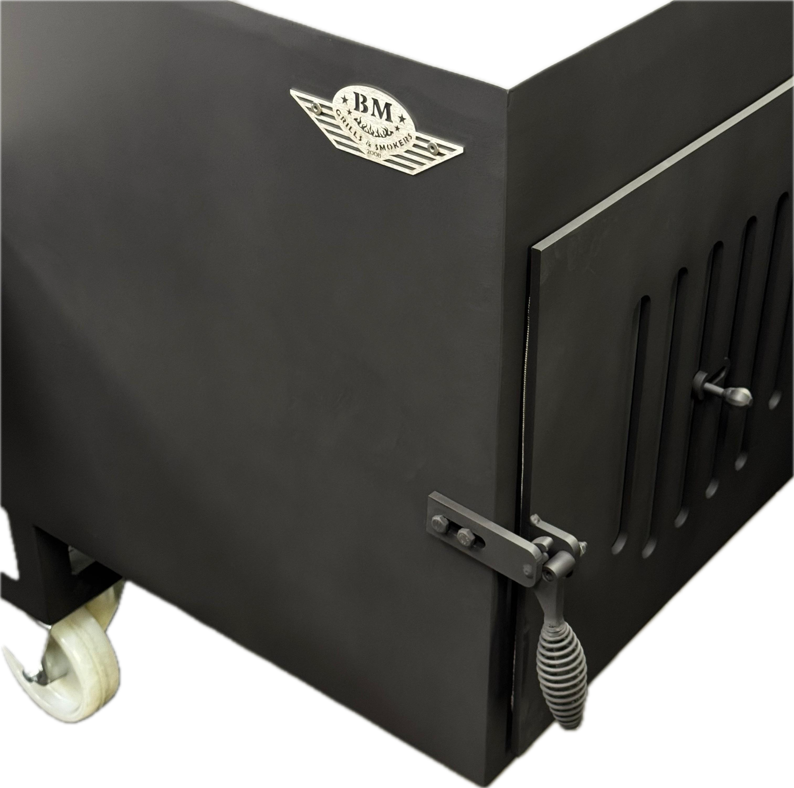 - Adjustable air intake dampers on the firebox door for airflow and cooking temperature control.